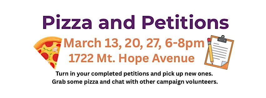 Pizza and Petitions!Drop off your completed petitions and pick up new ones. New to petitioning? We got you. Then have some yummy pizza a