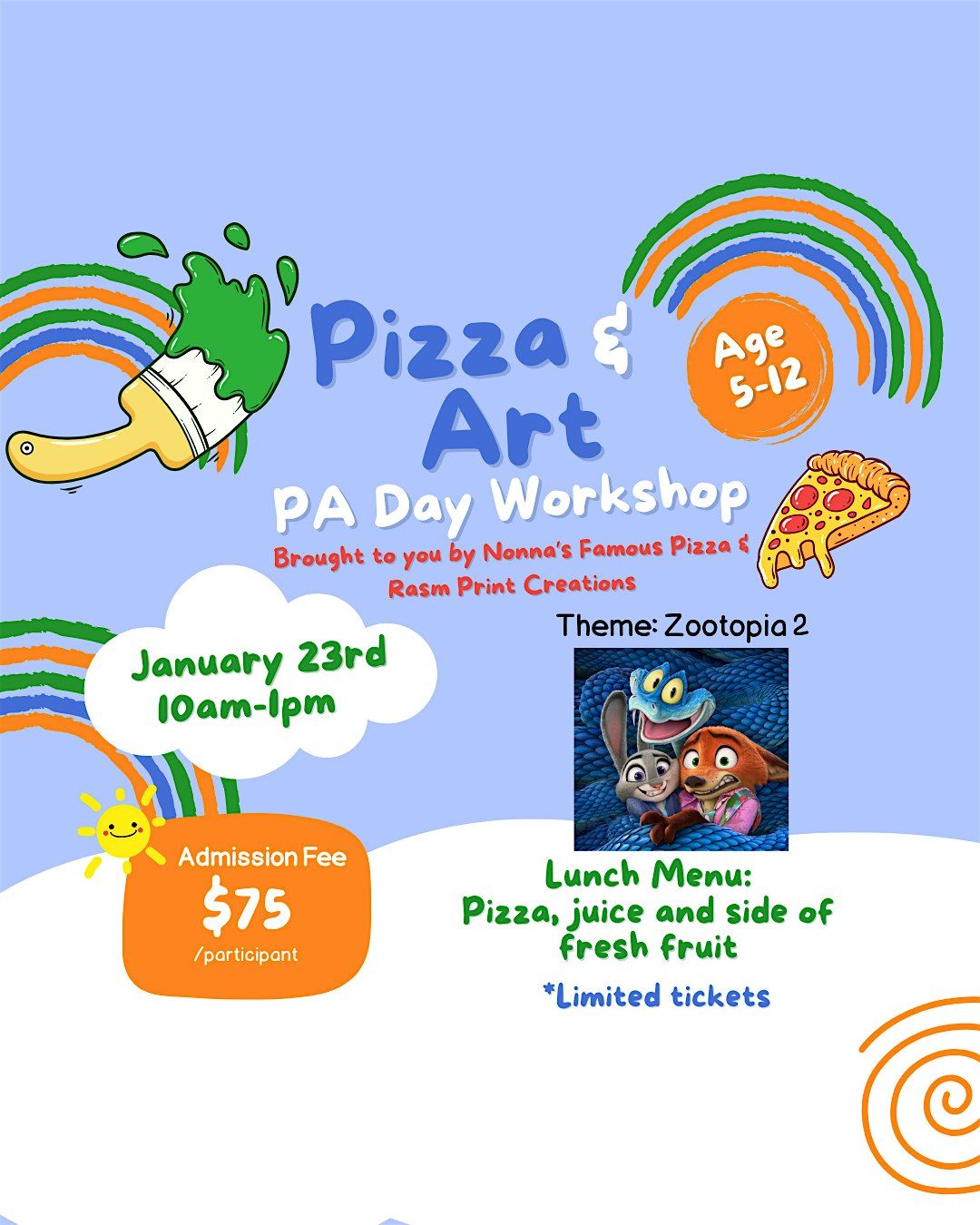 Join us for a fun-filled Pizza and Art PA Day Workshop on Friday, January 23rd! Children ages 5–12 are invited to unleash their creativity by designing unique Zootopia 2–themed artwork.