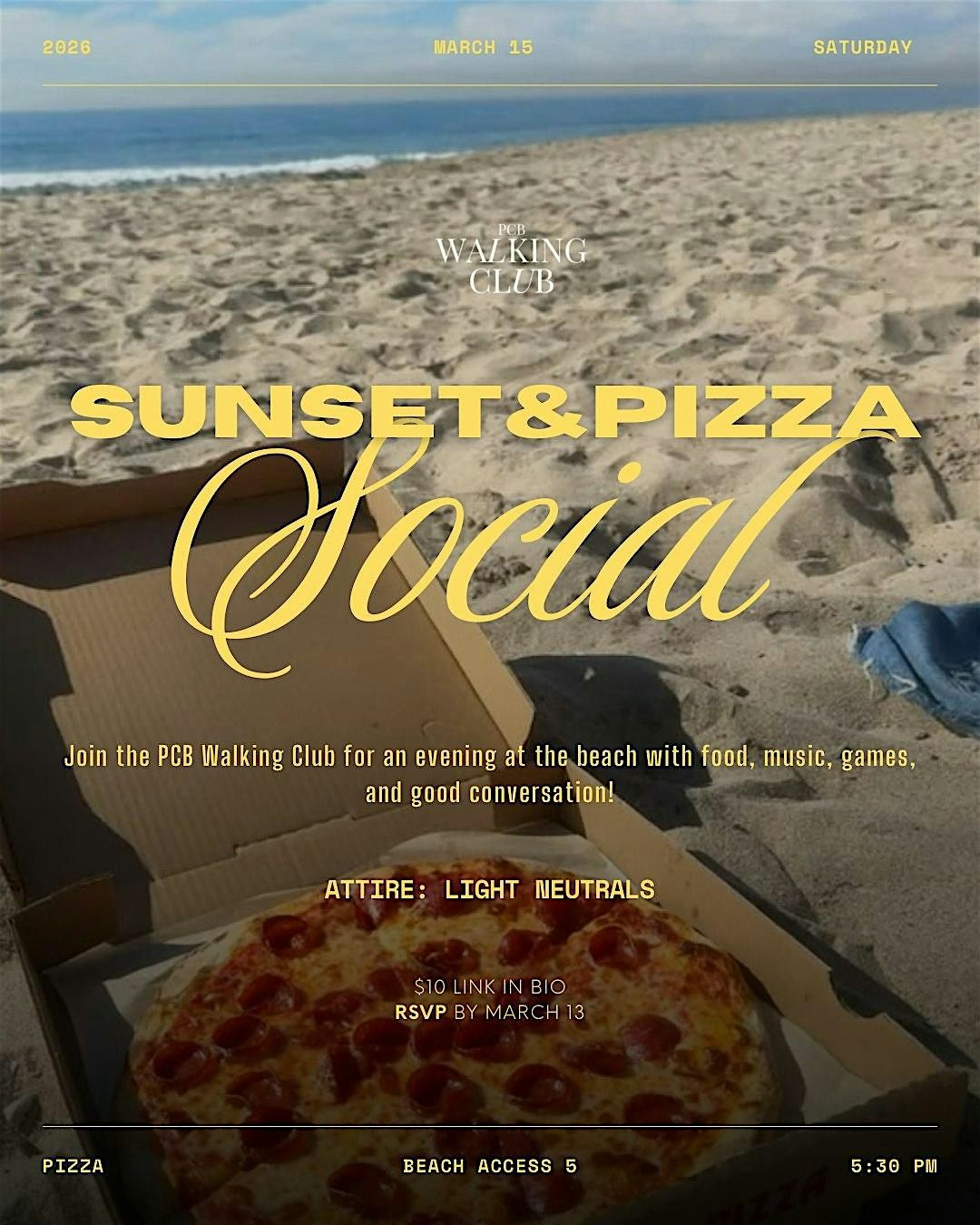Come spend the evening at the beach with the PCB Walking Club at our Pizza & Sunset Social. There will be music, fun activities, and time to relax and connect with the community with food and drinks provided. Please bring a beach chair or blanket and wear light neutrals.