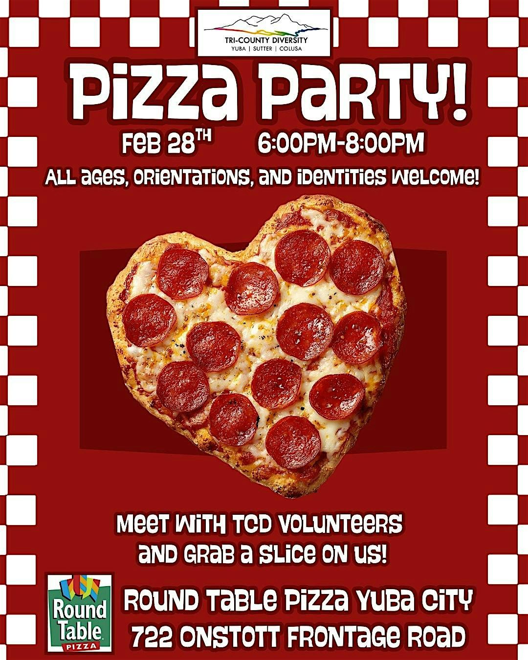 Join us all at Round Table Pizza (722 W Onstott Frontage Rd, Yuba City) in the Party Room from 6pm - 8pm on Saturday, Feb. 28th and grab a slice on Tri-County Diversity - meet and chat w/ TCD Volunteers, socialize with LGBTQ+ community, play games, and find out more about TCD and TCD programs and events.