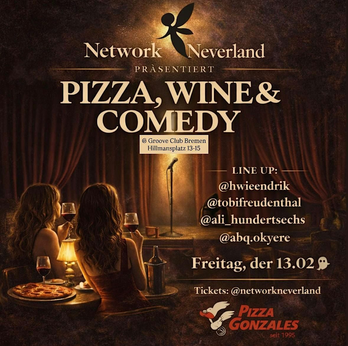 Am 13.02.25 findet im @groovebremenunser erstes Event des Jahres statt. Bei Pizza von @pizza_gonzales und Wein von @mitnig_kalbhenn , genießen wir eine Standup-Comedyshow im Stile der 80s in New York. Wir starten um 19 Uhr um uns kennenzulernen, zu networken und ein paar Drinks zu genießen. Anschließend schauen wir uns die Show von @hwieendrik @tobifreudenthal@ali_hundertsechs @abq.okyere an. Danach feiern wir gemeinsam bei guter Musik und kalten Drinks. Ab 23 Uhr öffnet der Club offiziell seine Türen. Gerne können wir auch bleiben und mitfeiern.