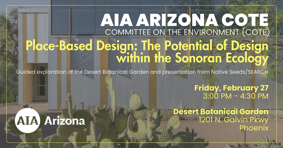 On Friday, February 27 join AIA Arizona Committee on the Environment (COTE) for a guided exploration of the Desert Botanical Garden, where attendees will deepen their understanding of Sonoran Desert ecology, plant adaptation, and conservation practices rooted in this region. Led by the design-build team, the tour will include the Exhibit Gallery, Ahearn Desert Learning Laboratory, and the Desert Learning Lab—place-based design-focused buildings that integrate principles of biomimicry and high-performing building standards. Together with presentations from Desert Botanical Garden and Native Seeds/SEARCH, this experience grounds design thinking in local ecology, culture, and mission-driven stewardship. Attendees will understand a stronger sense of place, enriched interdisciplinary collaboration, and thoughtful, context-responsive work in the built environment.