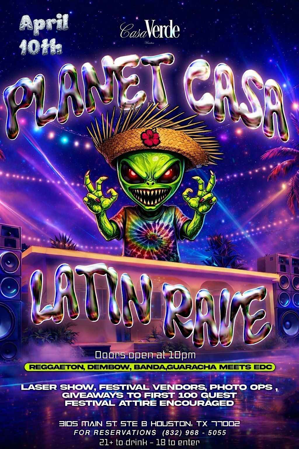 Planet Casa is where the best Latino hits meet EDM. Set under pulsating neon lights, this Latin-influenced rave fuses high-energy EDM, reggaeton , and house beats with vibrant Latin culture. Expect immersive visuals, immersive stage design, and a night that invites you to dance, connect, and celebrate community.