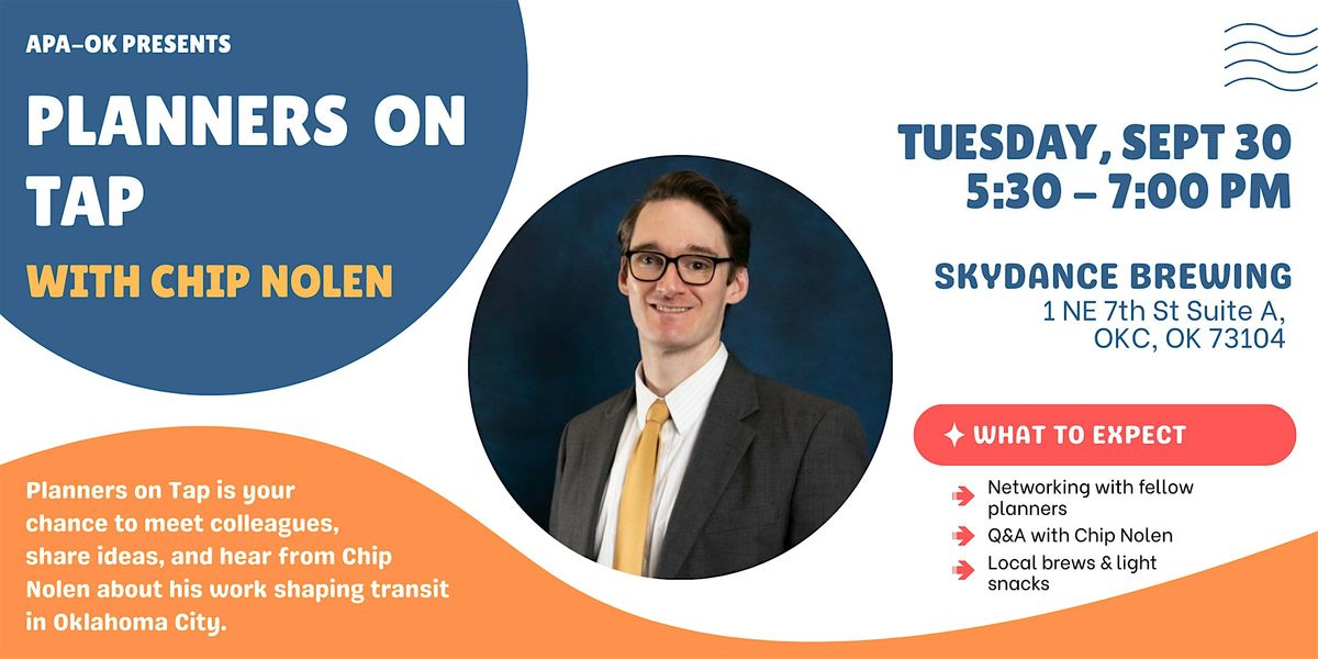 Join APA Oklahoma for Planners on Tap, a monthly happy hour event to socialize with fellow community planners and advocates across Oklahoma. Each session will feature a conversational Q&A with a planner doing great work in the state.