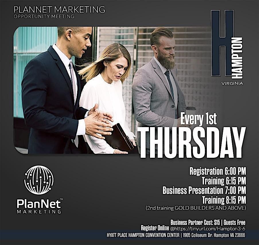 Come join us for an exciting opportunity to learn about PlanNet Marketing! Whether you're a seasoned network marketer or just curious about the industry, this event is perfect for you. Get ready to network with like-minded individuals, hear success stories, and discover how you can be a part of this amazing community. The event will be held at Hyatt Place Hampton Convention Center, so mark your calendars and don't miss out!