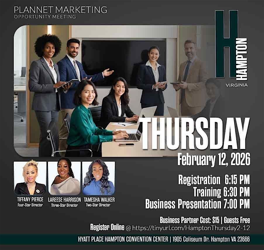Come join us for an exciting opportunity to learn about PlanNet Marketing! Whether you're a seasoned network marketer or just curious about the industry, this event is perfect for you. Get ready to network with like-minded individuals, hear success stories, and discover how you can be a part of this amazing community. The event will be held at Hyatt Place Hampton Convention Center, so mark your calendars and don't miss out!