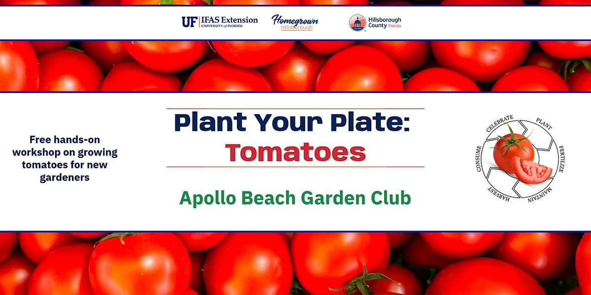 Welcome to Plant Your Plate: Tomatoes @ Apollo Beach Garden Club! Join us at the garden at 664 Golf and Sea Blvd, Apollo Beach, FL 33572 for an in-person demonstration that will give you the opportunity to get your hands dirty and connect with fellow gardening enthusiasts. Whether you're a seasoned gardener or just starting out, this event is perfect for anyone looking to incorporate tomatoes into their diet. Don't miss out on this chance to grow your own tomatoes and enjoy the fresh flavors straight from your garden!