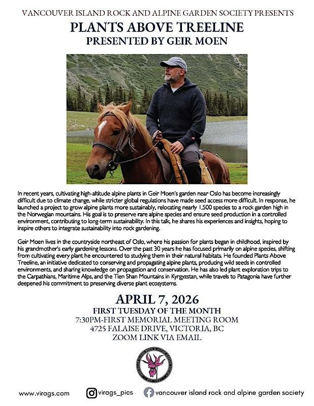 For more about the Vancouver Island Rock and Alpine Garden Society, visit https://www.virags.com. In-person and Zoom meetings (monthly other than July and August) are free for members. To join VIRAGS, visit https://www.virags.com/join.html: $20/year for individuals, $30/year for households. $6 cash drop-in fee for non-members. For the link to the Zoom meeting, e-transfer $6 to [email protected], noting your email address in the transfer.