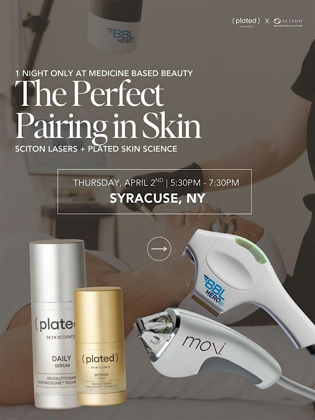 Join us for information sessions, demos, and giveaways as we share all the details you need to know about these services and products! There will be opportunities to ask questions to our Sciton and (plated) skincare science representatives as well as learn more about how these services and skincare products work so well together.