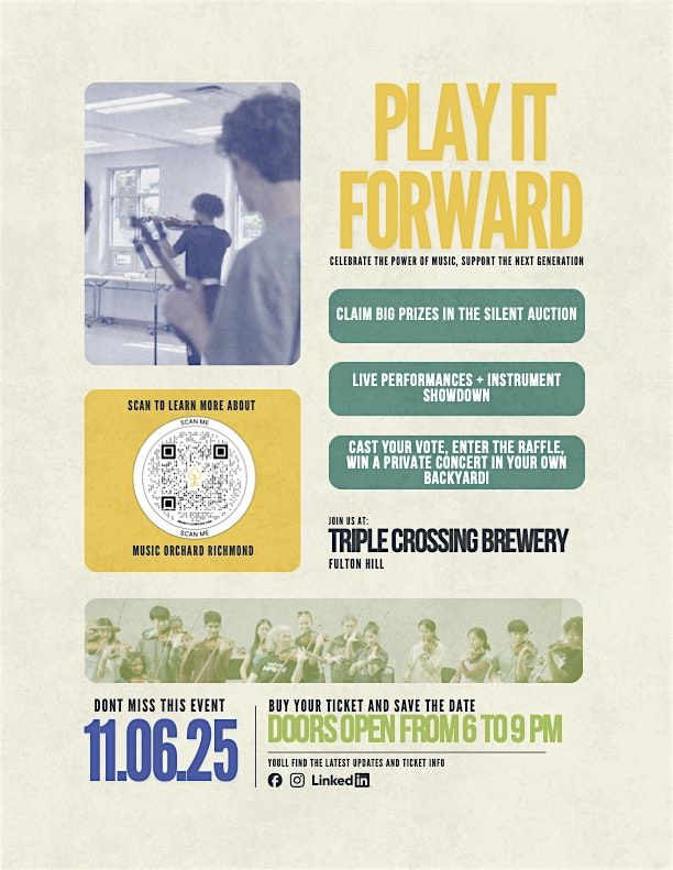 Play It Forward is Music Orchard Richmond’s signature fundraising celebration—where community, creativity, and a shared love of music come together for a powerful cause. Join us for an unforgettable evening filled with live performances including a friendly instrument showdown, a silent auction, raffle, and the joy of investing in Richmond’s young musicians.