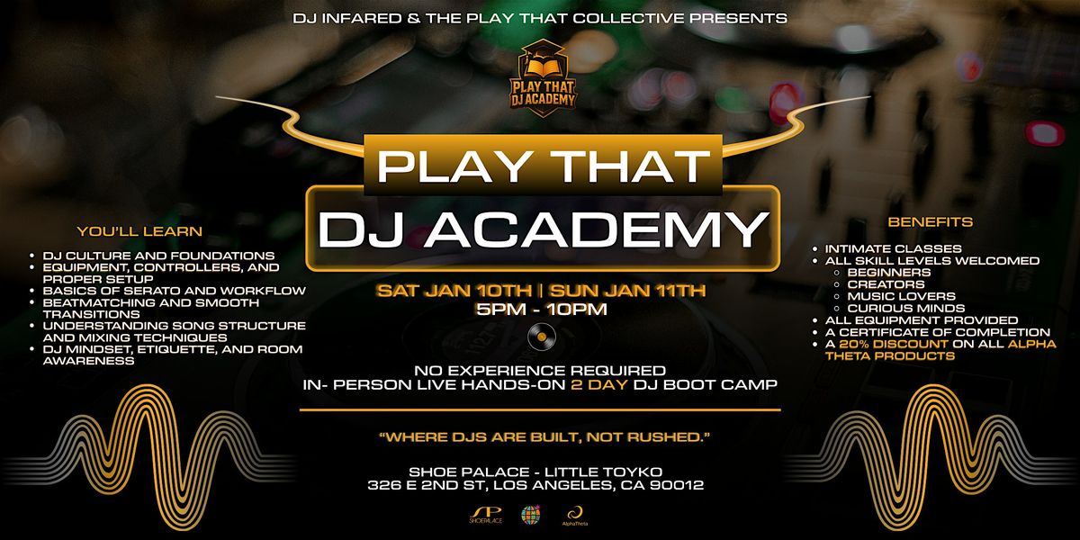 Ready to drop the beat and really learn how to DJ? Play That DJ Academy is a 2-day, in-person bootcamp built on real fundamentals, culture, and hands-on experience. Whether you’re just starting out or looking to sharpen your style, this is a focused space to learn, practice, and grow alongside other music lovers.