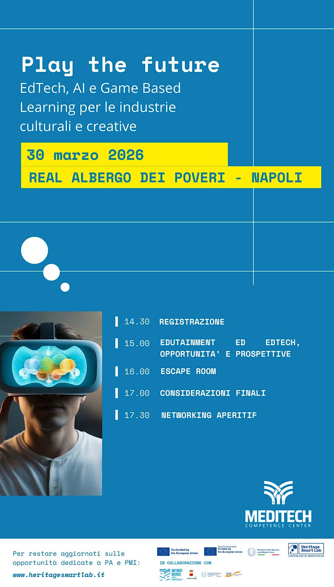 "Play the Future", evento promosso da MedITech nell'ambito dell'EDIH Hsl, in collaborazione con CTE Infiniti Mondi, si rivolge ad aziende e professionisti del settore, favorendo l'esplorazione delle metodologie e delle tecnologie che stanno ridefinendo la formazione: dall'Edutainment alla Gamification, dal Game-Based Learning all'Intelligenza Artificiale e alla Realtà Aumentata.
