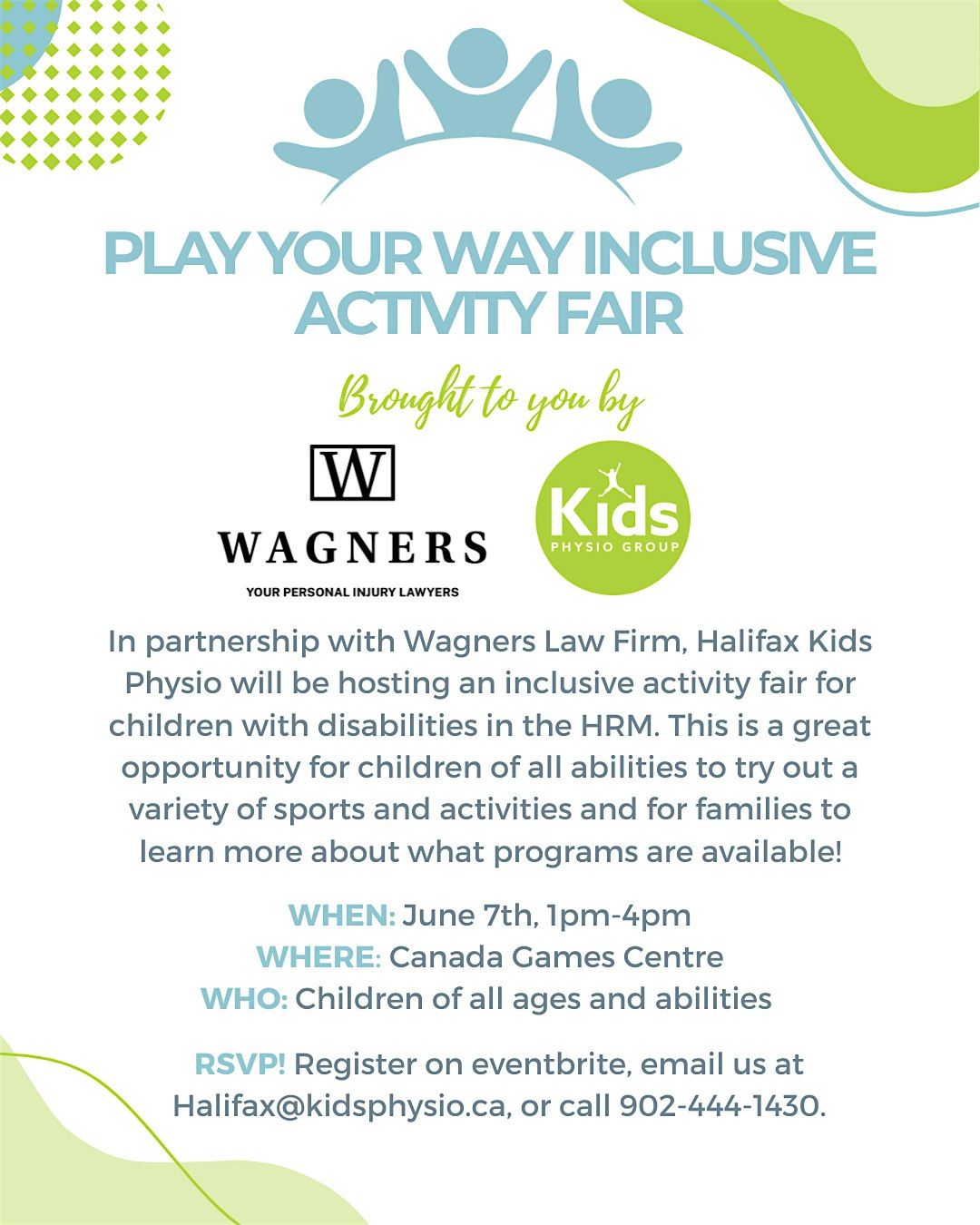 Join us in person for the Play Your Way Inclusive Activity Fair hosted in partnership with Wagners Law Firm! This FREE event is all about fun, inclusive activities designed to engage children of all abilities. Come learn about all the options for inclusive activities in HRM and try out some of the sports and programs!