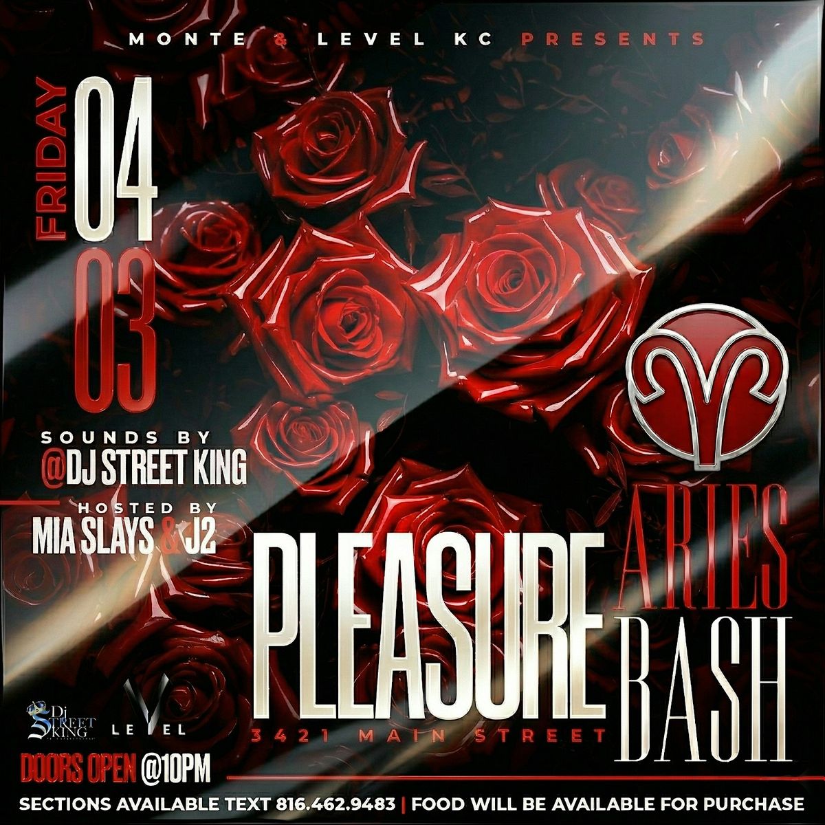 Come join us in a night full of top notch vibes at the “Pleasure” Aries Bash ♈️ , Hosted by Mia Slays & J2 - With music from Dj StreetKing .