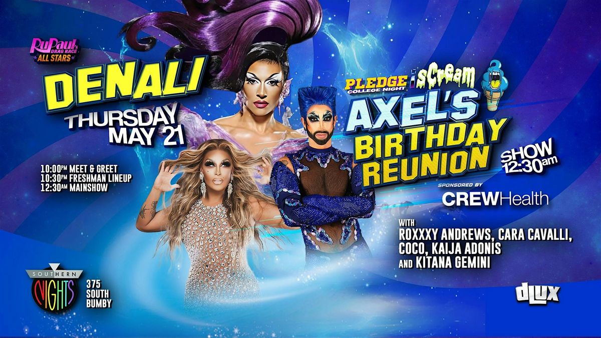 - 12:30am - Main Show Hosted by Axel Andrews featuring the college night cast, special guests and headliner Denali