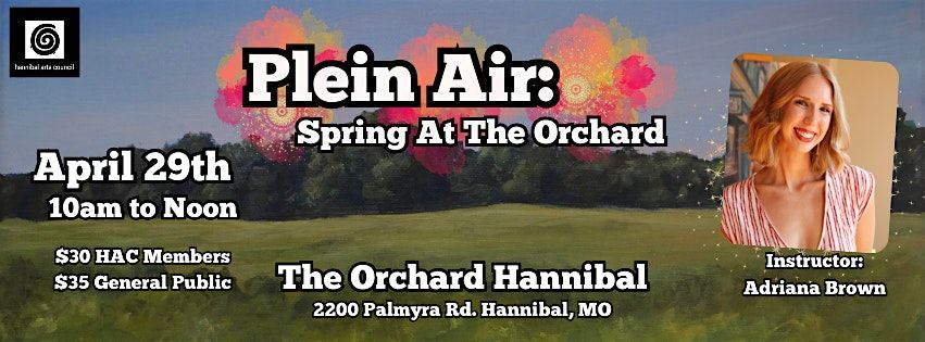 The Hannibal Arts Council invites adults 18 and up to escape the studio and explore the magic of plein air painting at the exciting on location workshop, Plein Air: Spring At The Orchard. Under the guidance of local artist Adriana Brown, this workshop offers participants the chance to create a plein air painting inspired by the picturesque landscapes and views at The Orchard. Bring your spring into full bloom with this creative and unique opportunity.