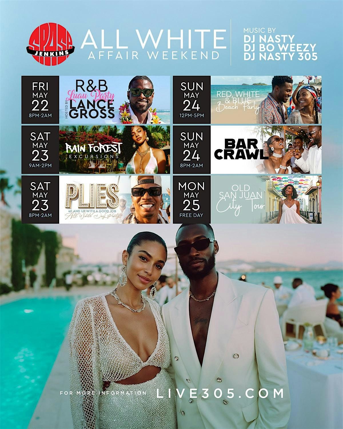 After we leave the jungle, we then move to the headliner of the weekend the "PLIES 40 AND UP WITH A GOOD JOB ALL WHITE AFFAIR" Join Plies and a few surprise guests as we party underneath the gorgeous Puerto Rican skyline!