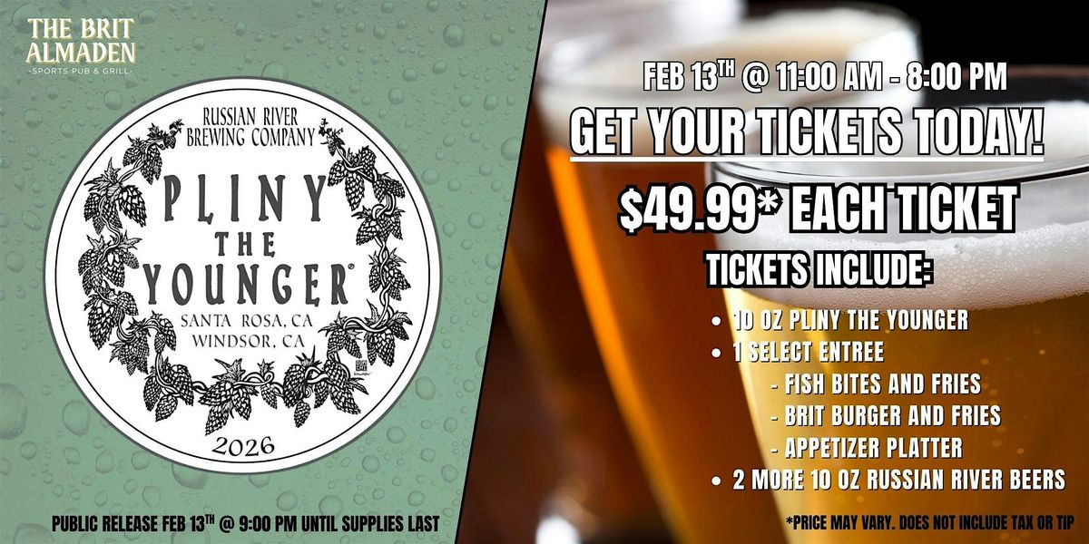 Enjoy Pliny the Younger Dinner at the Brit of Almaden before we tapp it for the public! This special ticketed event will get you a 10 oz Pliny the Younger, your choice between Fish Bites and Chips, a Brit Burger with fries, or an Appitizer Platter, AND 2 more 10 oz Russian River Beers on tap! Redeem your ticket on Friday, Feb 13th between 11:00 AM - 8:00 PM.