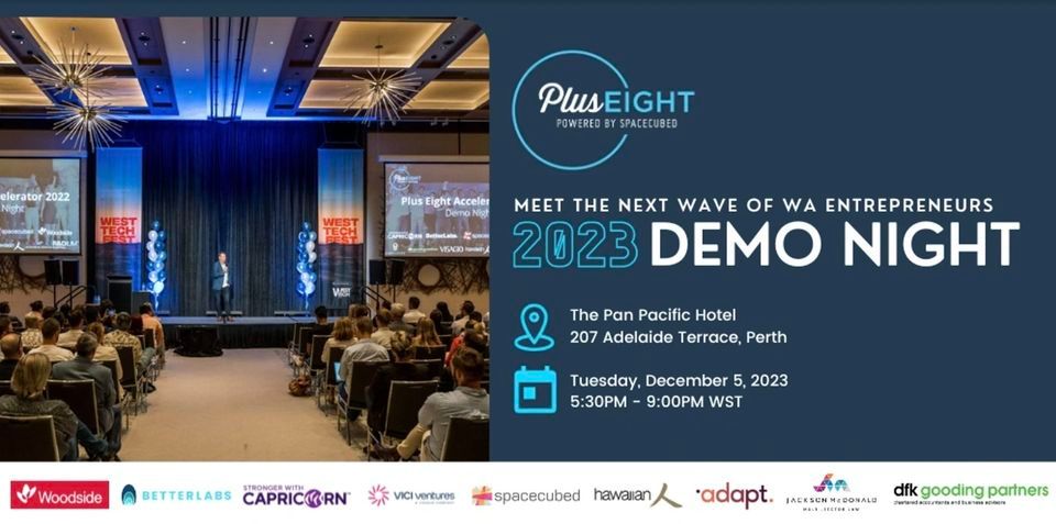 We are pleased to welcome to the stage the seventh cohort of our Plus Eight accelerator program for 2023.This year, Plus Eight Demo Night will be running as part of West Tech Fest and is your exclusive opportunity to get a seat in the audience to listen to six of the hottest Perth startups pitch their businesses, meet the founders, and network with over 200 members of the Perth startup scene.