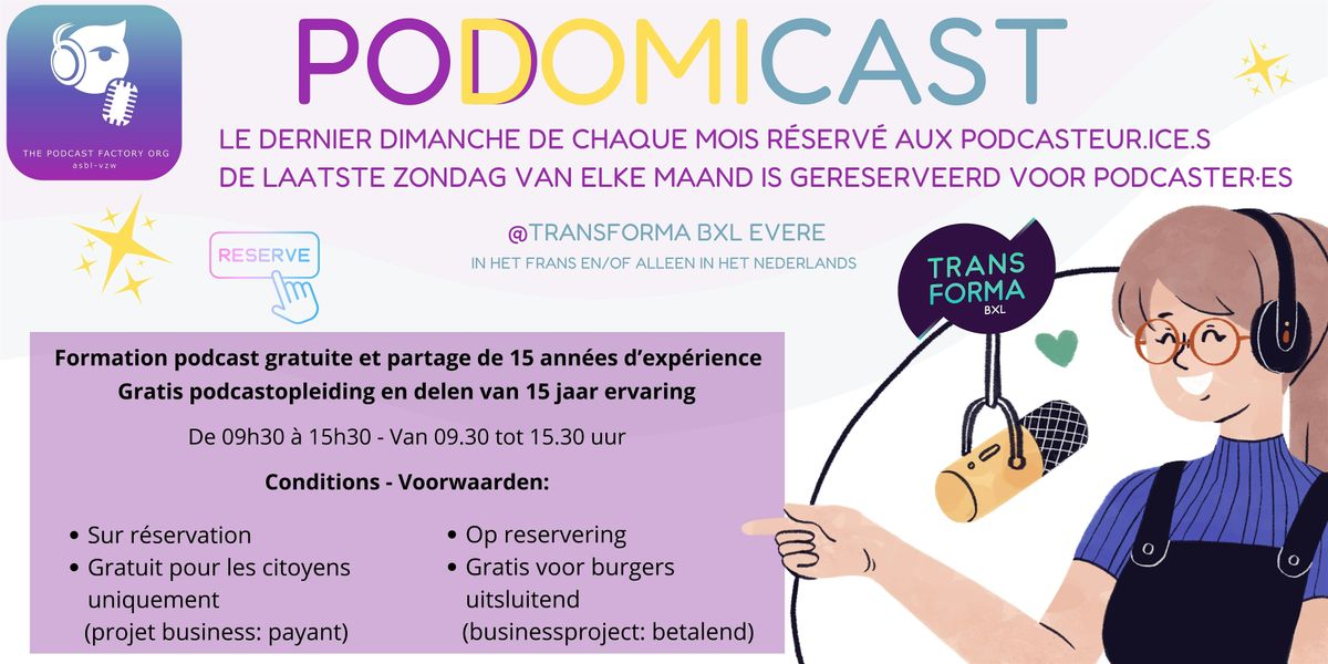 - En tant que membre de transforma bxl vous pouvez déjà utiliser notre studio podcast gratuitement chaque jour en le réservant dans l'intranet du coworking, mais vous pouvez dès maintenant réserver 1h avec assistance technique gratuite (en plus de la formation de base) chaque dernier dimanche du mois de 14h à 15h.