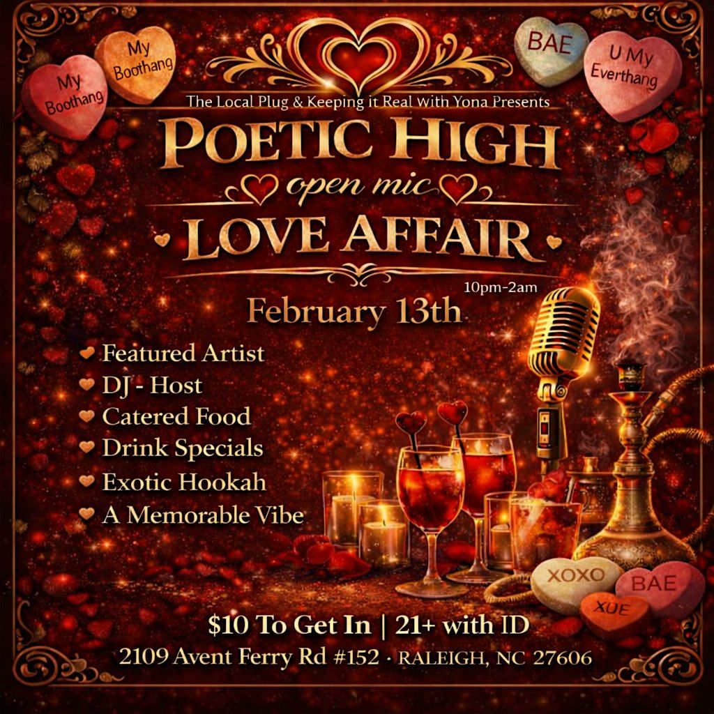 POETIC HIGH open mic Love Affair at Terminal 8 - Bar & Lounge on February 13, 2026 from 10:00 PM to 2:00 AM. Come join us for a night filled with poetry, music, and love. Let your creativity flow as you share your heartfelt words or simply enjoy the amazing performances. Don't miss out on this opportunity to connect with fellow artists and lovers of goood vibes. Pull up & spread the love, we'll love you back.