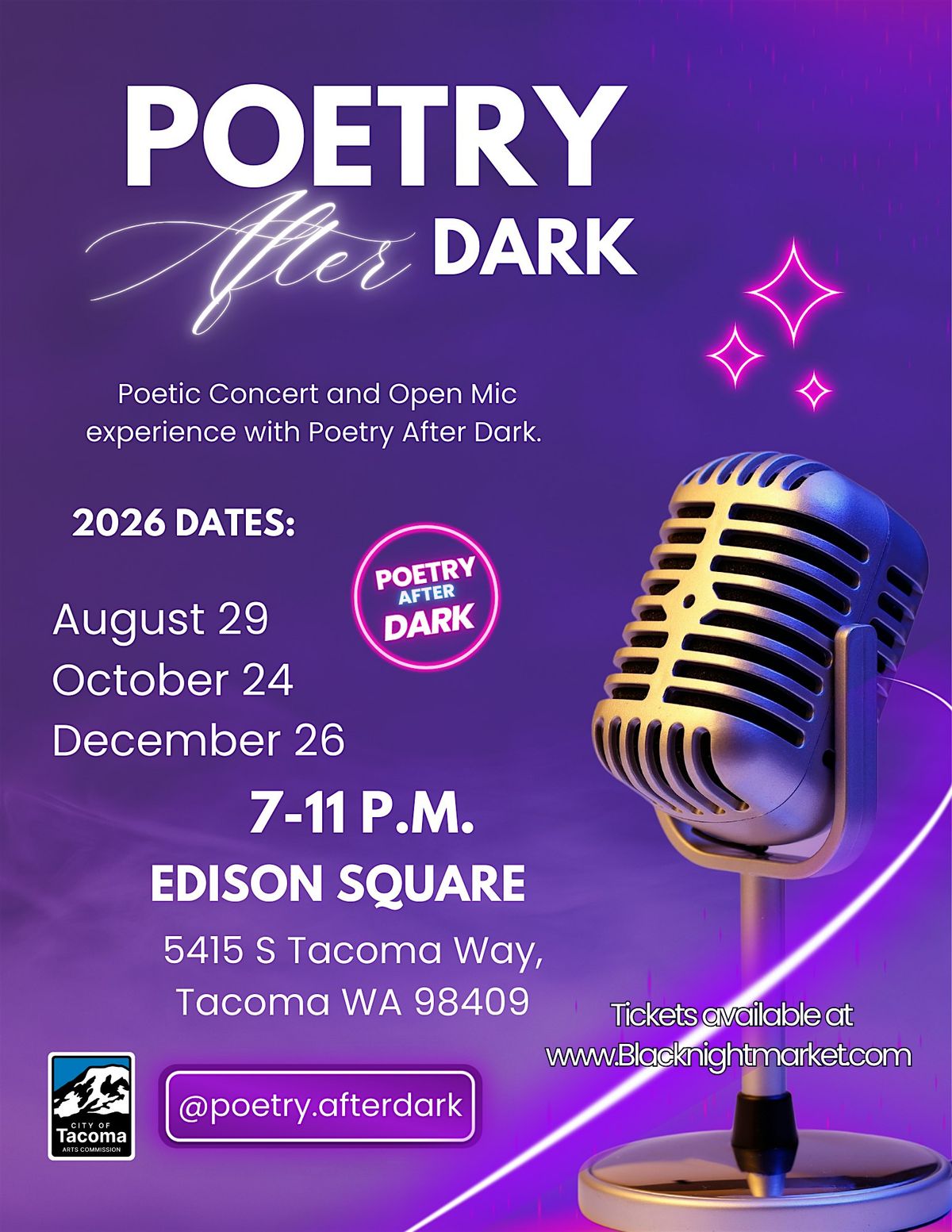 Step into an intimate evening of words, music, and connection at Poetry After Dark: Open Mic & Poetic Concert—a signature experience curated by Poetry After Dark x Black Night Market.