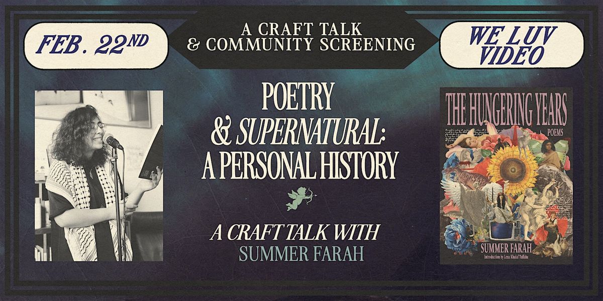 ✦ Join us for Poetry & Supernatural: A Personal History with Palestinian American poet and critic Summer Farah at the beloved We Luv Video’s micro-cinema theater. At this craft talk Farah will be discussing poetry, fandom, friendship, and the hit TV show Supernatural. Expect a poetry reading, art talk, clips from Supernatural, and a book signing!