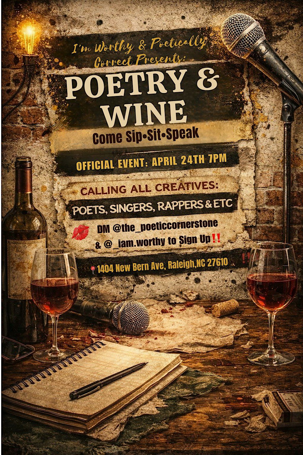 Looking for a chill evening filled with beautiful words and great vibes? Come sip on some fine wine while enjoying poets and artists performing live. This in-person event is perfect for anyone who loves good stories, good drinks, and good company. Bring your friends or come solo to soak in the creative atmosphere and maybe even share your own verses. Don’t miss out on this unique blend of art and relaxation—can’t wait to see you there!