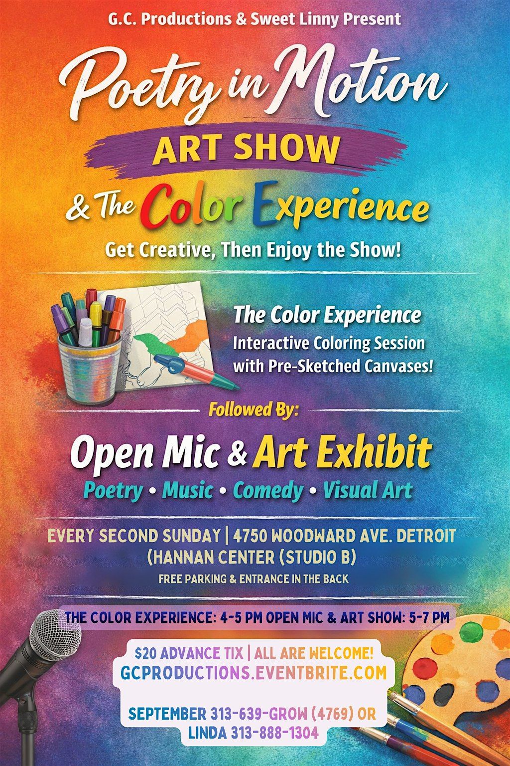 Poetry in Motion Art Show & The Color Experience is a vibrant, immersive community event blending live poetry, open mic performances, visual art, and interactive creativity. Guests begin with The Color Experience, an engaging hands-on coloring session using pre-sketched canvases and acrylic paint markers, then transition into a dynamic evening of spoken word, music, comedy, and art exhibitions. Designed to inspire connection, expression, and creativity, we are celebrating art in all its forms.