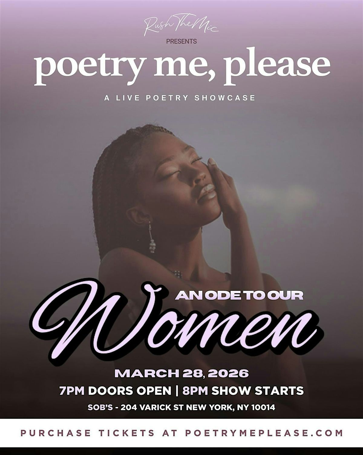 Celebrating Women's History Month, we're calling you to experience the fourth installment of our "Ode to Our Women" showcase. Pull up on Saturday, March 28, 2026, at the legendary SOB's (21+) for an unforgettable night honoring the strength and grace of women's voices. The PMP Poetry Series brings you an evening packed with powerful spoken-word performances, soul-stirring live music, a full-service seated dinner, and curated drinks to set the mood.