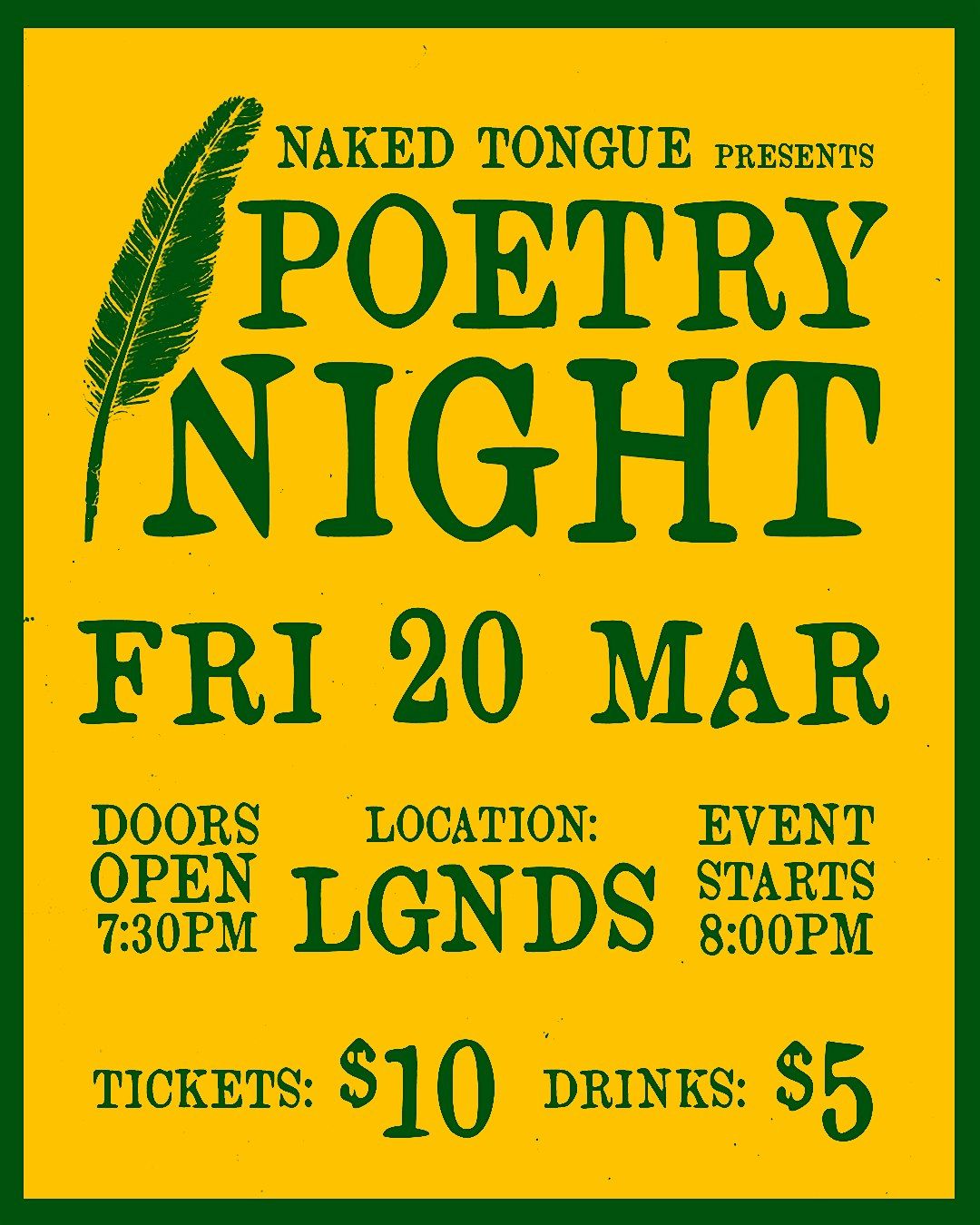 Naked Tongue Poetry Night is a space for truth-tellers, soul-speakers, and verse-slingers to bare it all. No filters, no fluff, just pure wordplay, emotion, and energy. Whether you’re spilling your heart or sipping something strong, come vibe with a crowd that knows poetry is power.
