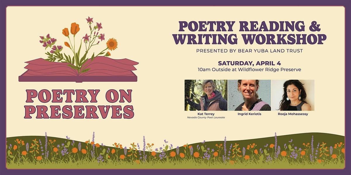 Join Nevada County Poet Laureate Karen Terrey and Poets Ingrid Keriotis and Rooja Mohassessy for a poetry reading and writing workshop at Bear Yuba Land Trust’s Wildflower Ridge Preserve. Under the cover of heritage oaks with a view of the mountains beyond, the poets will read poems inspired by the land, with prompts for participants to write and share their own poetry.