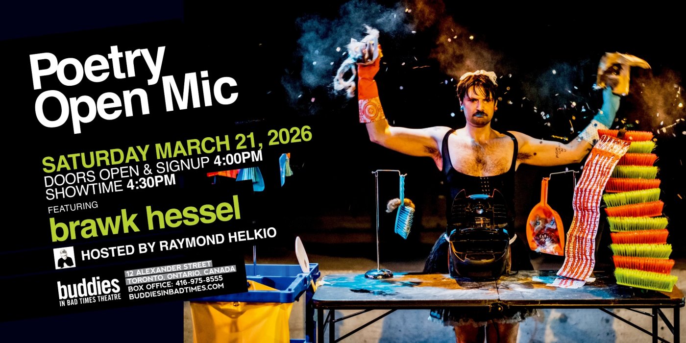 Buddies is a fully accessible venue with barrier-free, gender-neutral washrooms. Thank you to Jordyn Crawford, Jonathan Freeman, the staff at Buddies In Bad Times Theatre, Tallulah's Cabaret, and The Reading Salon.