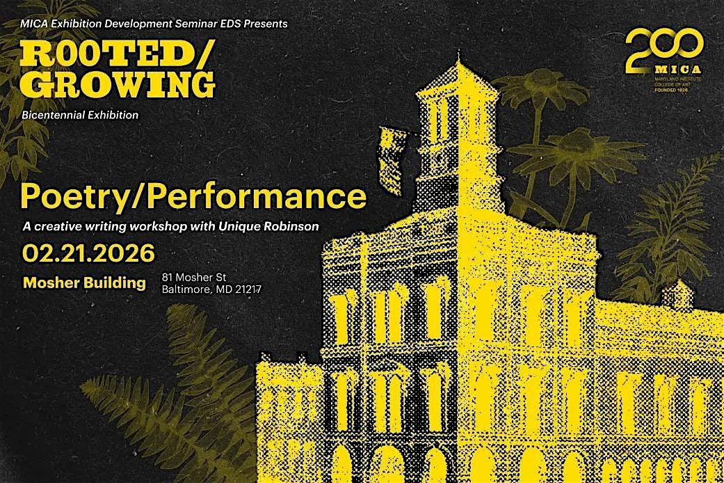 Limited spots available, held in the first floor of the Mosher building on MICA campus. Poetry prompts will revolve around the main themes of the Rooted/Growing exhibition, centering around community, growth, documentation, and Baltimore pride.