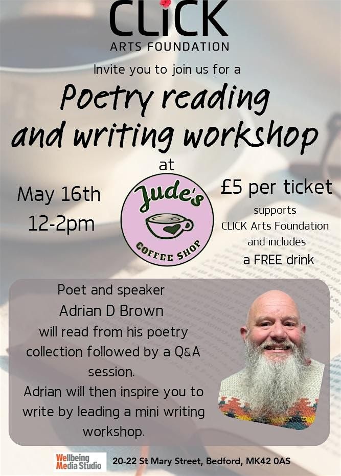 Join us at Jude's Cafe in Wellbeing Media Studio for a creative and relaxed afternoon of poetry with Adrian D Brown.