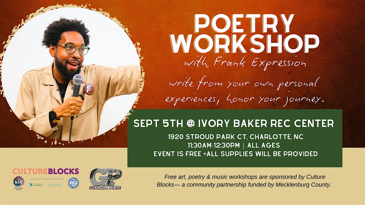 Free art, poetry & music workshops are sponsored by Culture Blocks— a community partnership funded by Mecklenburg County.