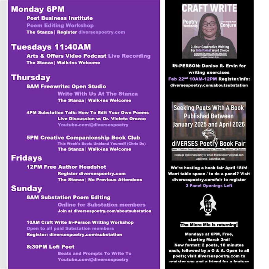 Sunday 10AM: our Craft Write workshop series is hosting its first in-person session with guest facilitator Denise R. Ervin! This workshop is open to all paid Substation members (diversespoetry.com/aboutsubstation)