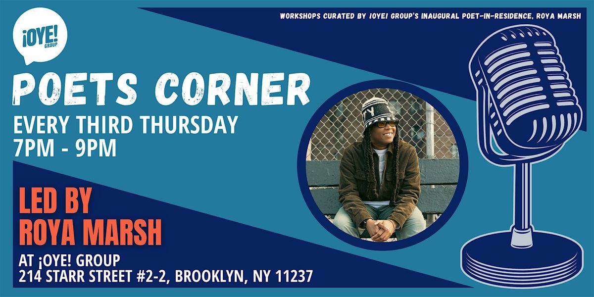 This series of workshops is curated by ¡OYE! Group’s inaugural Poet-in-Residence, Roya Marsh.