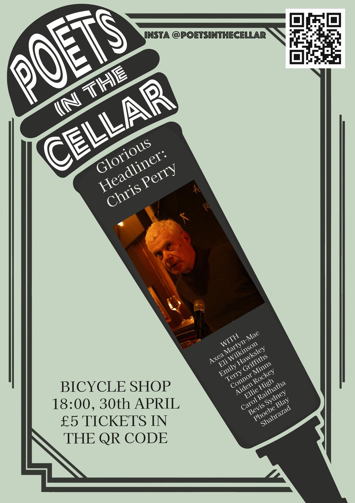 Hey people, welcome back to another Poets in the Cellar. This time we have more poetry and even more cellar. For our April installment, I have the pleasure of introducing our wonderful headliner, Chris Perry. Chris will be joined by a plethora of Norfolk's finest poets, who will provide you with an unforgettable evening of entertainment and inspiration. So grab a ticket, come on down, and hear what the cellar has to offer this month.Doors open: 18:00Event starts: 18:30Poets, please let me know ASAP if you can no longer perform. Poets get a free ticket for themselves and a free drink at the bar, courtesy of the Bicycle Shop. Disclaimer: