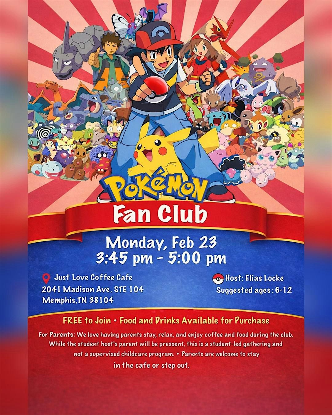 Come join us for a day filled with Pokemon fun and excitement. Whether you're a seasoned trainer or just starting your journey, this event is perfect for fans of all ages.(suggested ages 6-12 years old)