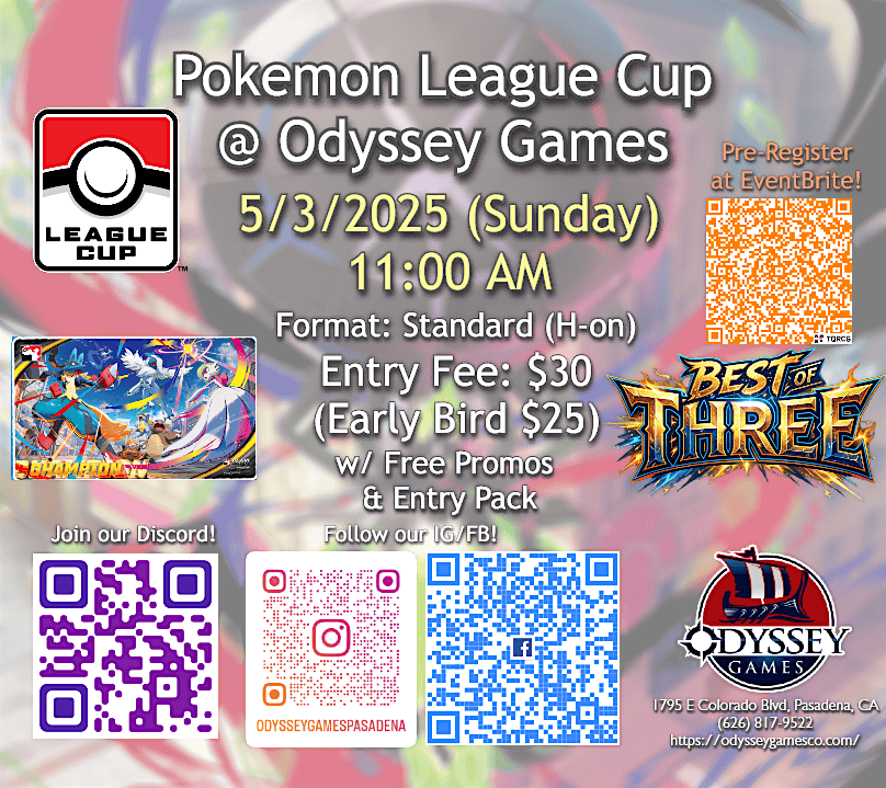 1) You can pre-register at Eventbrite page https://www.eventbrite.com/e/pokemon-tcg-league-cup-apr-may-best-of-three-odyssey-games-pasadena-tickets-1986029451552?aff=oddtdtcreator before May 3rd to enjoy the early bird price.