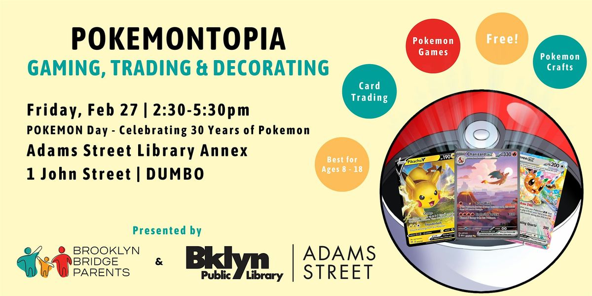 Think you have what it takes to be a Pokémon Master? Join us on February 27th the 30th birthday of Pokemon with a fan gathering at the Adams Street Library Annex! Whether you’re a competitive battler or a Master Collector, there’s a spot for you. Free and best for ages 8-18. Kids and teens can come alone or can be dropped-off. The event will take place at the Annex of Adams Street Library at 1 John Street.