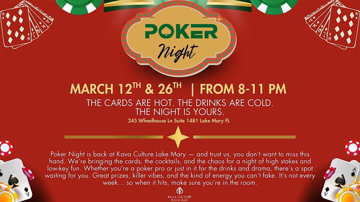 Poker Night is back at Kava Culture Lake Mary — and trust us, you don’t want to miss this hand. We’re bringing the cards, the cocktails, and the chaos for a night of high stakes and low-key fun. Whether you're a poker pro or just in it for the drinks and drama, there’s a spot waiting for you. Great prizes, killer vibes, and the kind of energy you can’t fake. It’s not every week… so when it hits, make sure you’re in the room.