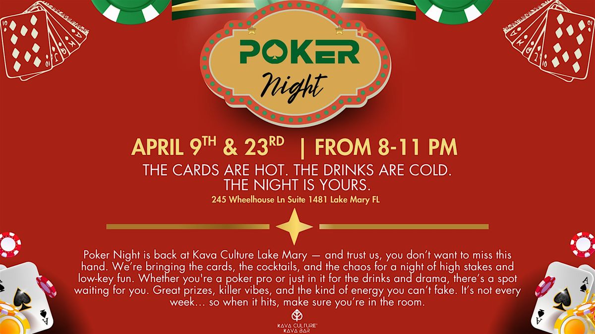 Poker Night is back at Kava Culture Lake Mary — and trust us, you don’t want to miss this hand. We’re bringing the cards, the cocktails, and the chaos for a night of high stakes and low-key fun. Whether you're a poker pro or just in it for the drinks and drama, there’s a spot waiting for you. Great prizes, killer vibes, and the kind of energy you can’t fake. It’s not every week… so when it hits, make sure you’re in the room.