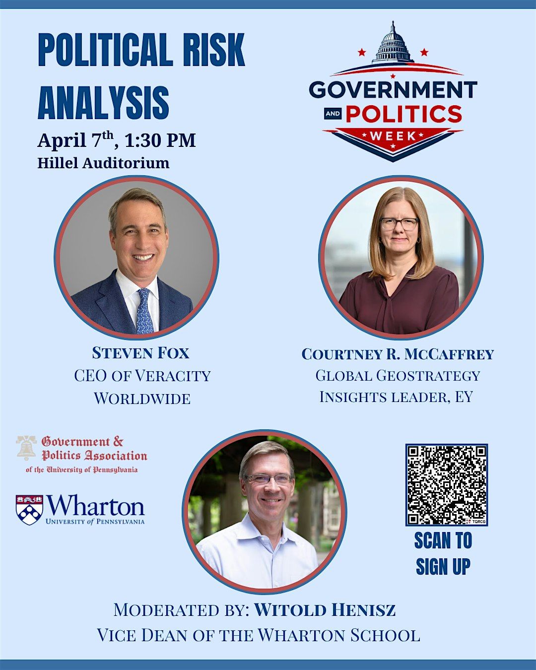 Get ready for an engaging session at the Hillel Auditorium on April 7, 2026 at 1:30 PM. We'll dive into the latest trends and challenges in political risk, breaking down the possibiliites in the industry with Steven Fox, CEO of Veracity, Courtney McCaffrey, Global Leader at EY, and Vice Dean Witold Henisz. Don’t miss out!