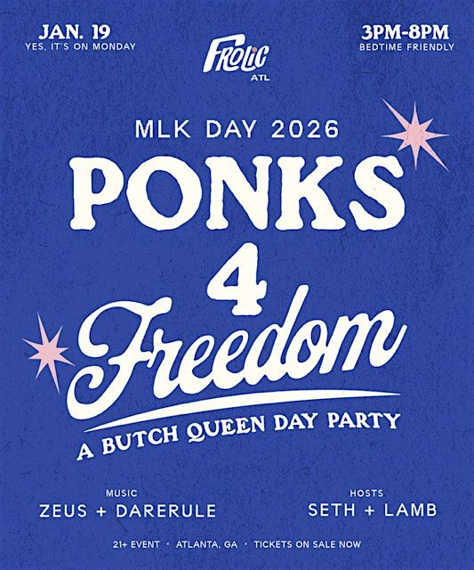 Join us this MLK Day for Ponks 4 Freedom — a daytime celebration made for butch queens and those who love them. Expect good music, good energy, and a room full of community.