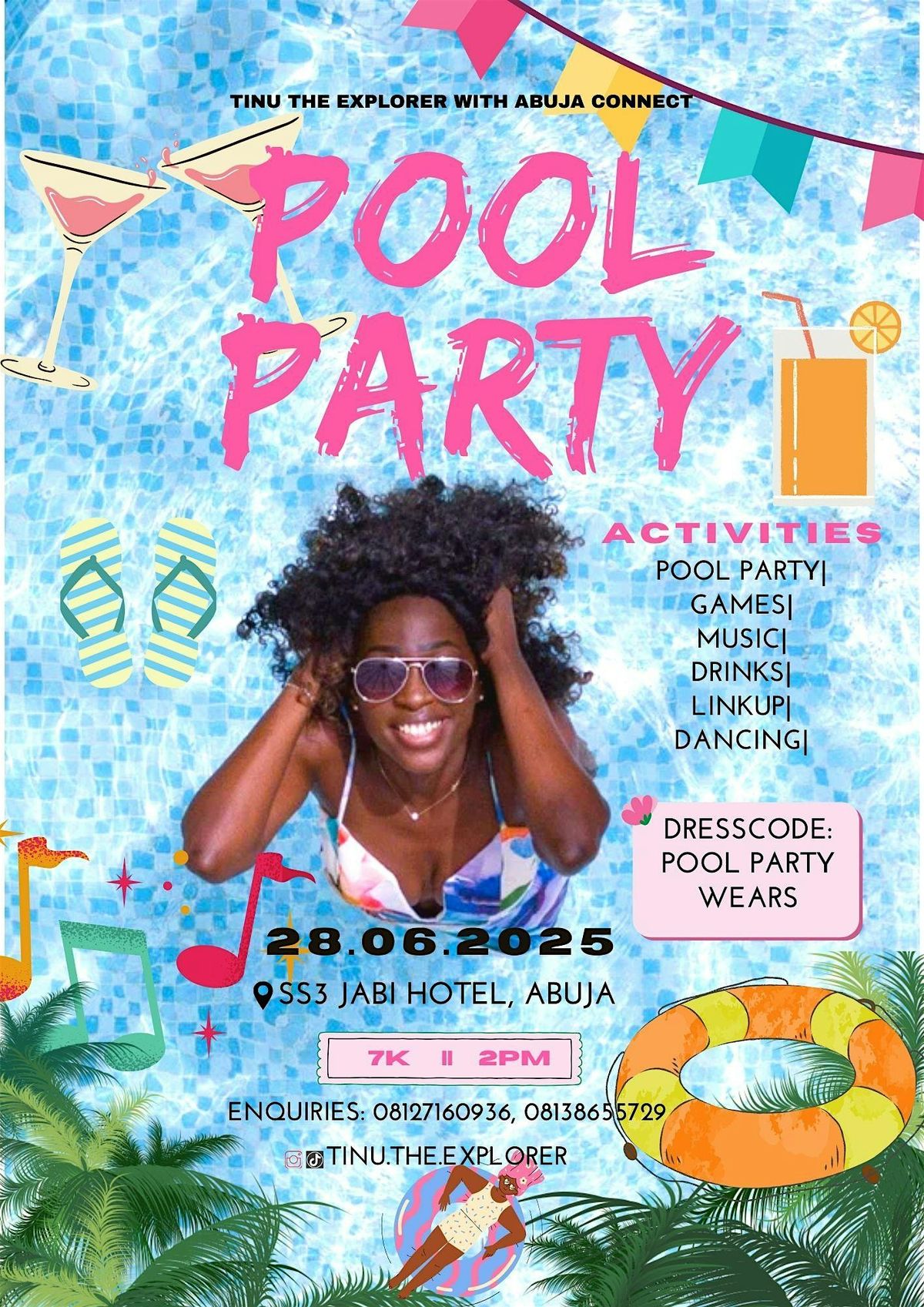 Come join us for a splashing good time at our pool party! Get ready with your #7k fee to soak up the sun, enjoy cool drinks, and dance to the hottest beats. The event will be held at SS3 Jabi Hotel, so grab your swimsuit and your friends for a day of fun in the sun. Don't miss out on the ultimate summer experience!