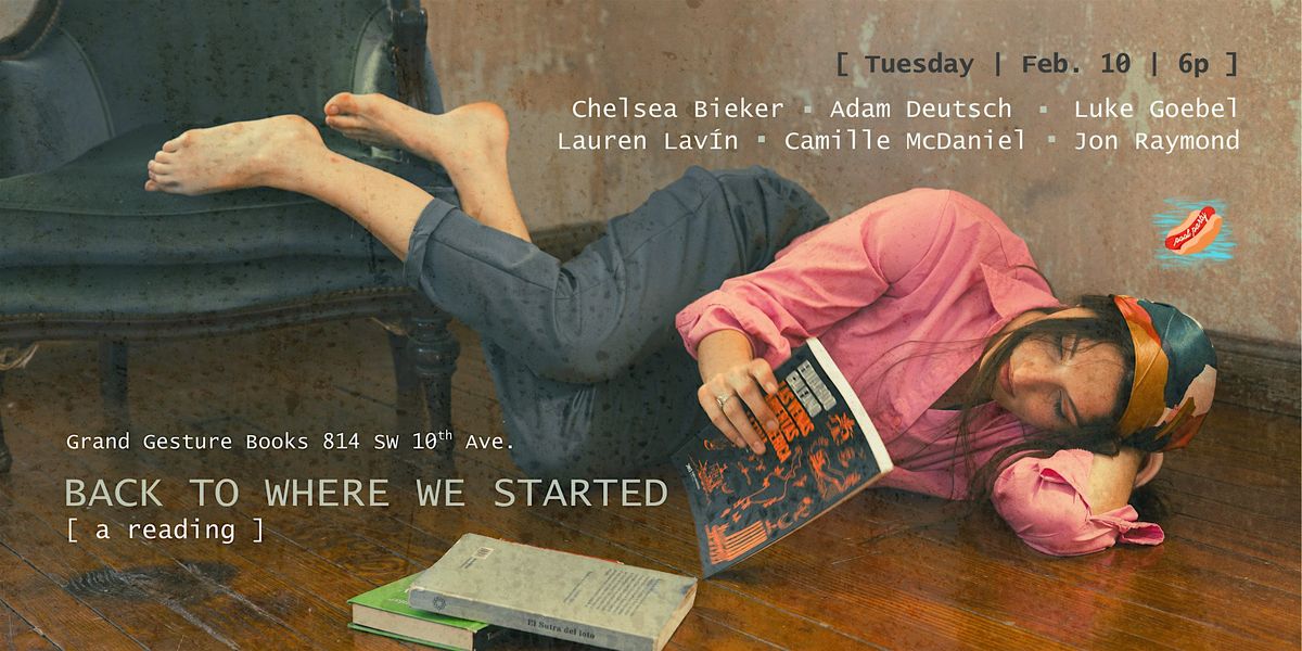 Pool Party Presents: Back to Where We Started, a one-year anniversary reading at Grand Gesture Books featuring Portland writers Chelsea Bieker, Jon Raymond, and Camille McDaniel, and visiting authors Adam Deutsch (San Diego), Luke Goebel (L.A./PDX), and Lauren Lavín (Seattle)!