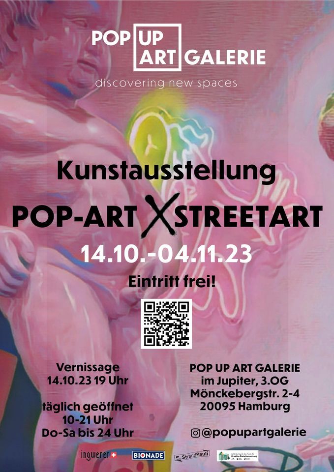 << Look forward to a bold fusion of cultures, as the POP UP ART GALLERY proudly presents its newest and last group exhibition at Jupiter: "Pop-Art X Streetart". From national to international artists, including some whose identities remain a secret on the streets of Hamburg - this exhibition is a kaleidoscope of creative energies! >>