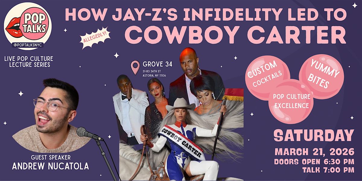 Join us in person for a deep dive presentation by Andrew Nucatola, host of the podcast and newsletter Too Pop To Handle. Together we'll discuss how Jay-Z's alleged cheating scandals influenced Beyoncé's creation of her album Cowboy Carter, a culture-defining musical americana opus of the 2020s. While we connect the pins with red yarn, grab some yummy after school snacks at the bar and taste one of our three signature custom cocktails for purchase. And don't forget to join our raffle for a chance to win Pop Talks merch!